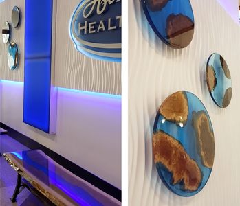 Custom live edge Black Walnut benches with resin river inlay, in combination with custom acrylic, burlwood sculptures & fabric lightbox displays create an eye catching environment.